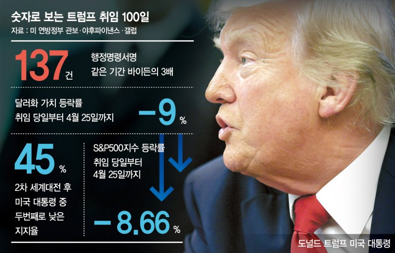트럼프 대통령 취임 후 100일 동안 총 137건의 행정명령에 사인하며 철저하게 미국 우선주의(아메리카 퍼스트)와 마가(MAGA·미국을 다시 위대하게)를 실천했다. 트럼프가 서명한 137건의 행정명령 중 핵심은 중국에 최고 145%의 관세를 부과하는 관세 정책이다. 일련의 트럼프 정책은 시장에 불확실성을 촉발시켰고 미국 경제를 흔드는 역풍으로 작용했다. 트럼프 취임 후 스탠더드앤드푸어스(S&P)500 지수는 8.66%, 6개 주요국 대비 달러화 가치는 약 9% 하락했다. 취임 후 이달까지 갤럽 등 각 여론조사 기관에서 실시한 트럼프에 대한 평균 지지율은 45%, 이는 2차 세계대전 이후 취임한 대통령 중 역대 두번째로 낮은 것이다.